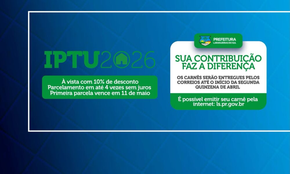 A Prefeitura de Laranjeiras do Sul deu início à campanha do Imposto Predial e Territorial Urbano, o IPTU 2026. Os carnês serão entregues pelos Correios até...