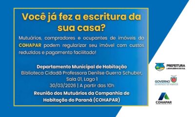 A Companhia de Habitação do Paraná (COHAPAR) estará novamente em Laranjeiras do Sul no próximo dia 30 de março de 2026, das 10h às 12h e das...