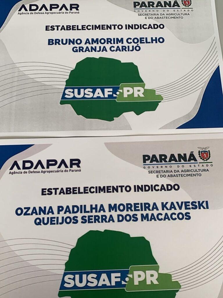 Nesta sexta-feira (10), as Agroindústria, Queijaria Serra dos Macacos e Granja Carijó receberam o certificado do SUSAF – Sistema Unificado Estadual de Sanidade Agroindustrial Familiar, Artesanal e de Pequeno Porte. Com o reconhecimento, ambas poderão comercializar seus produtos em todo o Paraná, fortalecendo a agricultura familiar e levando o nome de Nova Laranjeiras para além das fronteiras do município.