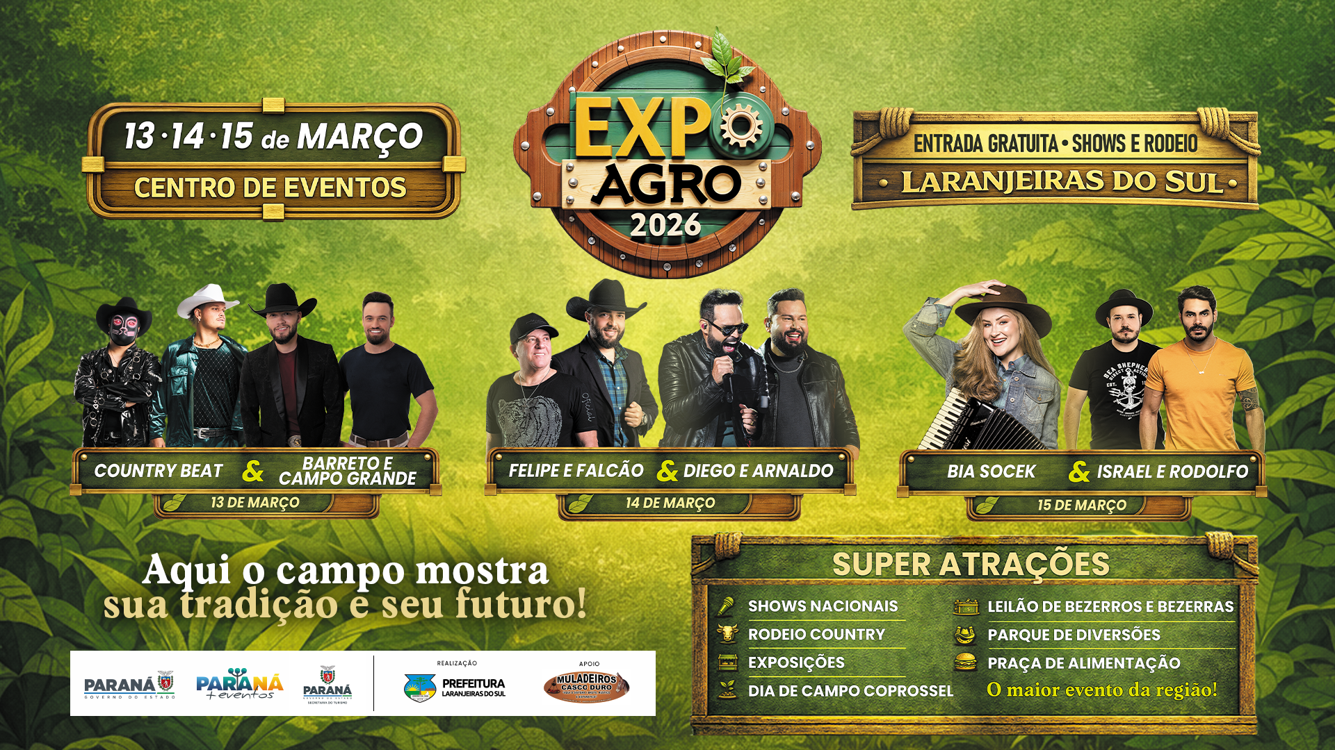 A ExpoAgro 2026 é uma realização da Prefeitura de Laranjeiras do Sul, com apoio dos Muladeiros Casco Duro, e se consolida como um dos principais eventos do agronegócio no Estado, fortalecendo o setor produtivo, o comércio local e a identidade cultural do município. “Aqui o campo mostra sua tradição e seu futuro”, ressalta o slogan da feira, que promete três dias de celebração da força do agro paranaense.