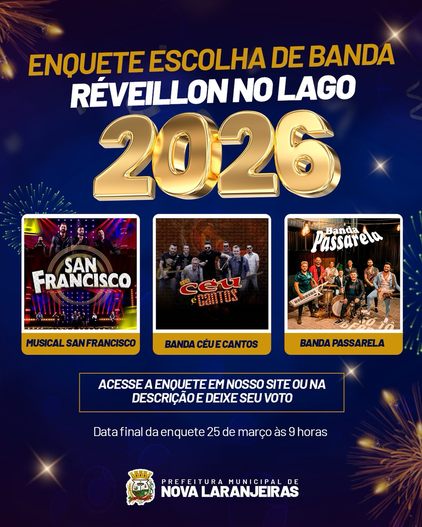 A Administração Municipal de Nova Laranjeiras abriu uma enquete pública para definir a atração musical do Réveillon 2026/2027. A iniciativa busca envolver a comunidade na escolha da banda que irá animar a virada de ano no município.