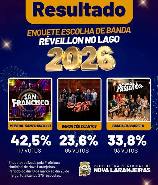 A Administração Municipal de Nova Laranjeiras divulgou o resultado da enquete pública que definiu a banda responsável por animar o Réveillon no Lago. A escolha contou...