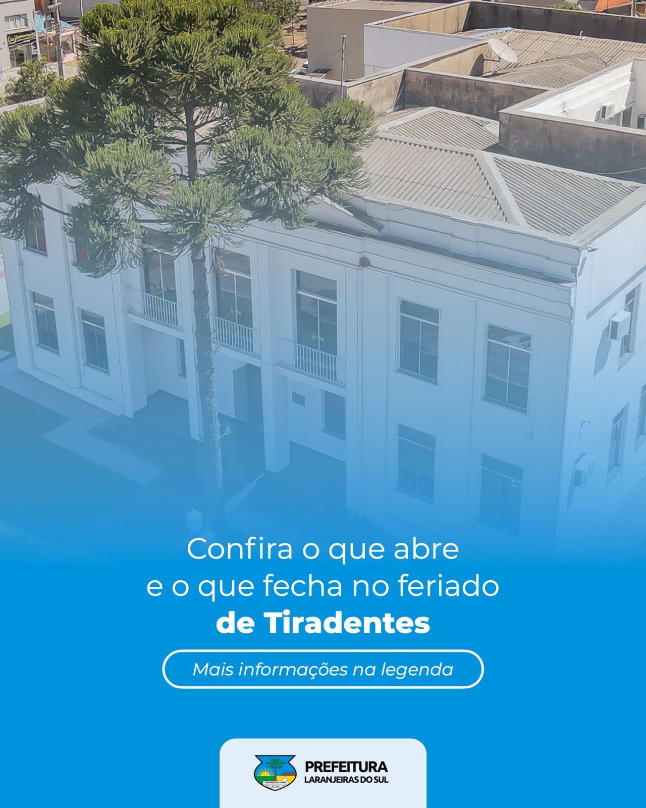 Em razão do feriado de Tiradentes e conforme o Decreto nº 046/2026, a Prefeitura de Laranjeiras do Sul e demais repartições públicas municipais terão alterações no atendimento ao público nos próximos dias.